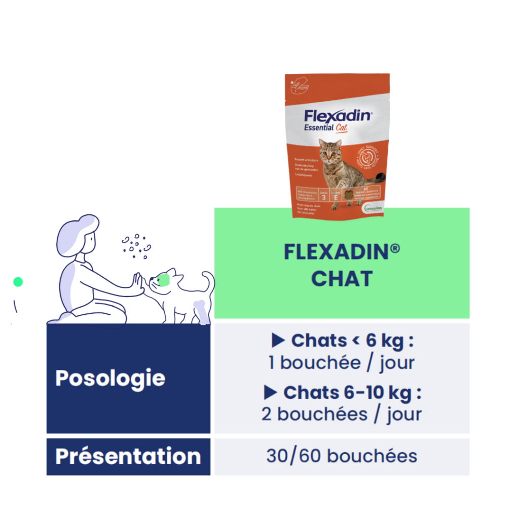 Les ingrédients contenus dans Flexadin Essentiel agissent au niveau articulaire afin de préserver la mobilité de votre animal. Ils limitent l’inflammation et retardent la destruction du cartilage articulaire.